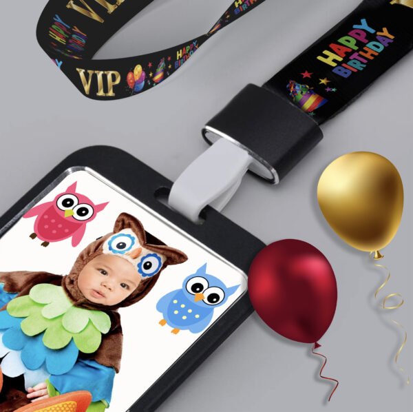 Our PVC VIP Birthday Invitations are printed in vibrant colors on a plastic PVC card, measuring 3 3/8″ x 2 1/8″, the size of a credit card. Each invitation is accompanied by a sleek black Aluminum Badge Holder, and the back side displays all the necessary information for your upcoming celebration. And to complete the VIP experience, our custom Birthday Lanyards are the perfect accessory for these one-of-a-kind invitations!
