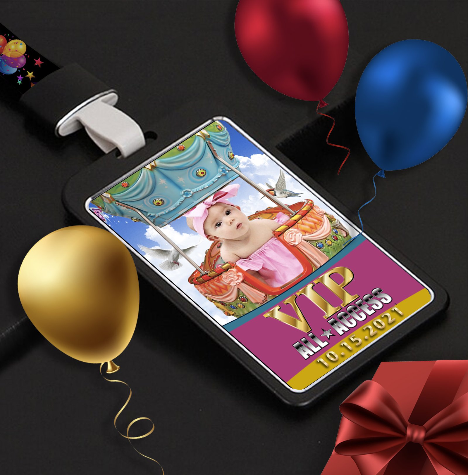 Our PVC VIP Birthday Invitations are printed in vibrant colors on a plastic PVC card, measuring 3 3/8″ x 2 1/8″, the size of a credit card. Each invitation is accompanied by a sleek black Aluminum Badge Holder, and the back side displays all the necessary information for your upcoming celebration. And to complete the VIP experience, our custom Birthday Lanyards are the perfect accessory for these one-of-a-kind invitations!