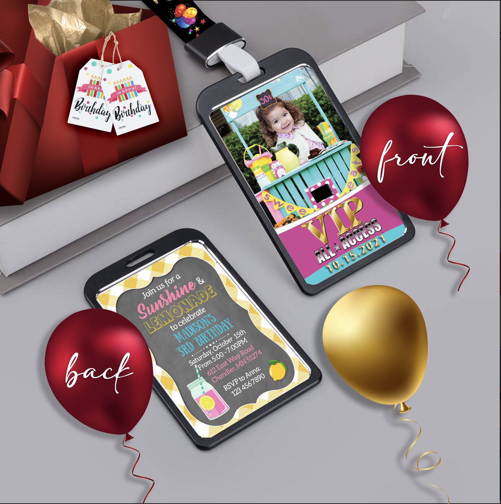 Our PVC VIP Birthday Invitations are printed in vibrant colors on a plastic PVC card, measuring 3 3/8″ x 2 1/8″, the size of a credit card. Each invitation is accompanied by a sleek black Aluminum Badge Holder, and the back side displays all the necessary information for your upcoming celebration. And to complete the VIP experience, our custom Birthday Lanyards are the perfect accessory for these one-of-a-kind invitations!