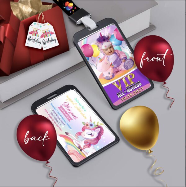 Our PVC VIP Birthday Invitations are printed in vibrant colors on a plastic PVC card, measuring 3 3/8″ x 2 1/8″, the size of a credit card. Each invitation is accompanied by a sleek black Aluminum Badge Holder, and the back side displays all the necessary information for your upcoming celebration. And to complete the VIP experience, our custom Birthday Lanyards are the perfect accessory for these one-of-a-kind invitations!