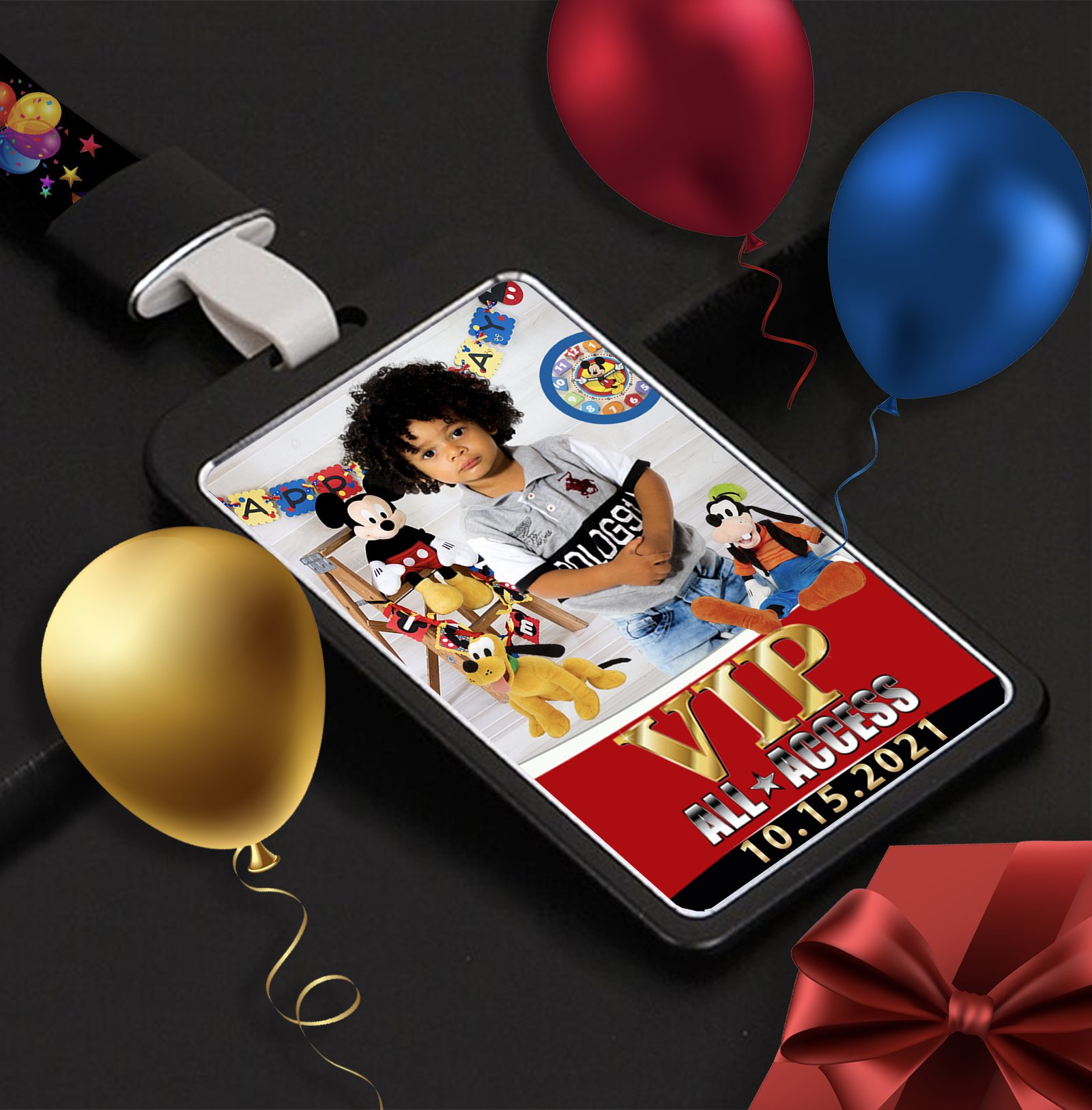 Our PVC VIP Birthday Invitations are printed in vibrant colors on a plastic PVC card, measuring 3 3/8″ x 2 1/8″, the size of a credit card. Each invitation is accompanied by a sleek black Aluminum Badge Holder, and the back side displays all the necessary information for your upcoming celebration. And to complete the VIP experience, our custom Birthday Lanyards are the perfect accessory for these one-of-a-kind invitations!