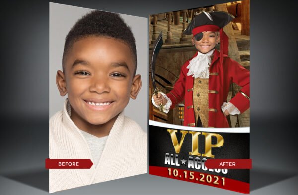 Make your child the star of their own special day with our Digital Backgrounds and costume Overlays! We’ll bring their imagination to life in stunning detail. Check out our before and after photos to see just how amazing your design can turn out. Throughout the process, we’ll work closely with you to ensure that your VIP Invitation matches your vision flawlessly.