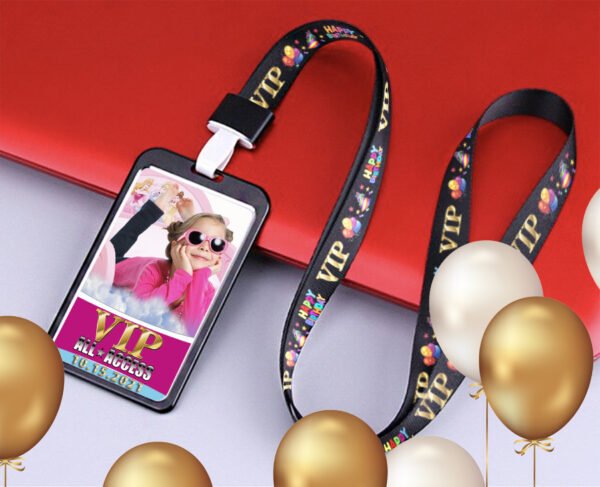 Our PVC VIP Birthday Invitations are printed in vibrant colors on a plastic PVC card, measuring 3 3/8″ x 2 1/8″, the size of a credit card. Each invitation is accompanied by a sleek black Aluminum Badge Holder, and the back side displays all the necessary information for your upcoming celebration. And to complete the VIP experience, our custom Birthday Lanyards are the perfect accessory for these one-of-a-kind invitations!