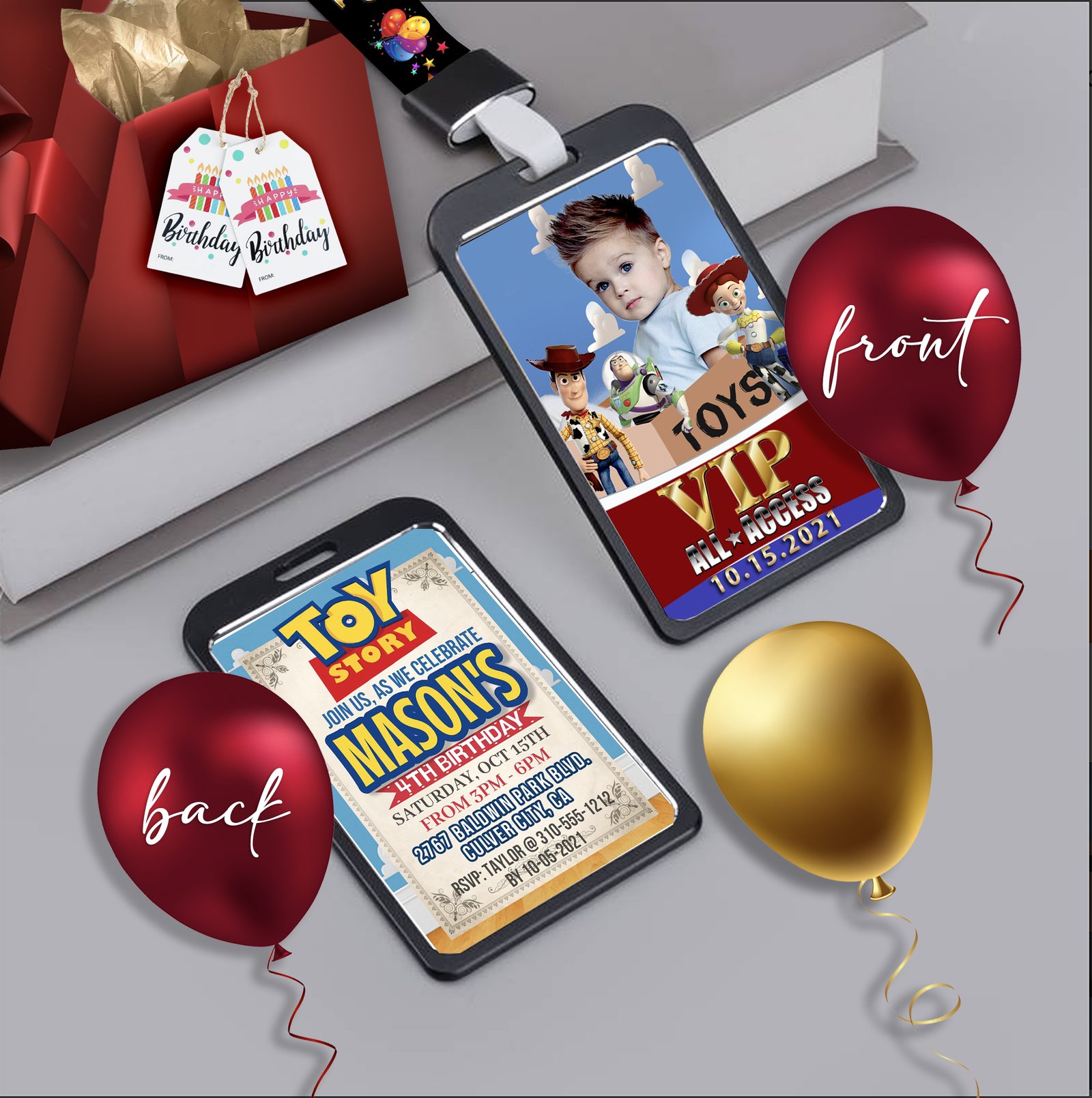 Our PVC VIP Birthday Invitations are printed in vibrant colors on a plastic PVC card, measuring 3 3/8″ x 2 1/8″, the size of a credit card. Each invitation is accompanied by a sleek black Aluminum Badge Holder, and the back side displays all the necessary information for your upcoming celebration. And to complete the VIP experience, our custom Birthday Lanyards are the perfect accessory for these one-of-a-kind invitations!