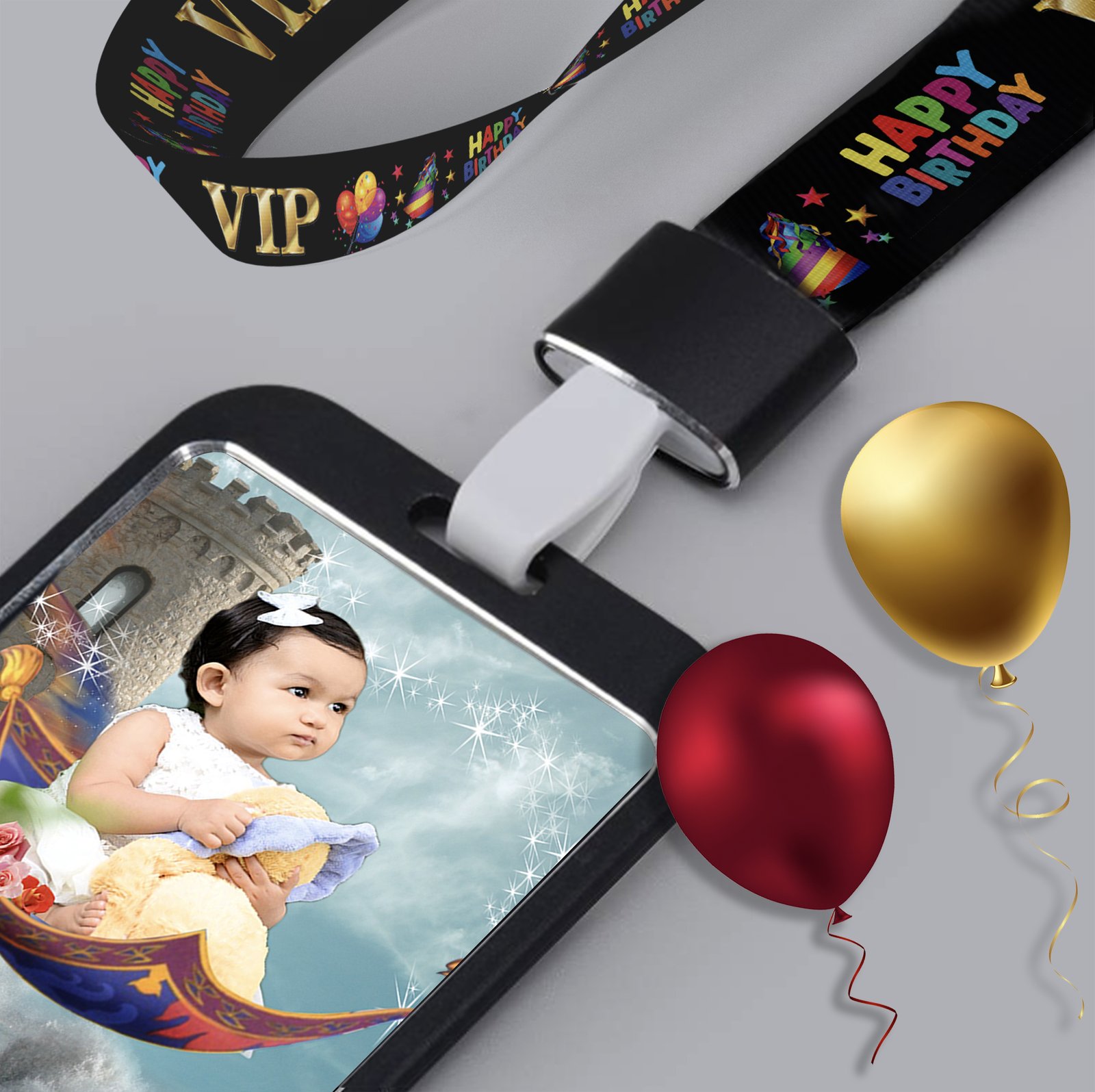 Our PVC VIP Birthday Invitations are printed in vibrant colors on a plastic PVC card, measuring 3 3/8″ x 2 1/8″, the size of a credit card. Each invitation is accompanied by a sleek black Aluminum Badge Holder, and the back side displays all the necessary information for your upcoming celebration. And to complete the VIP experience, our custom Birthday Lanyards are the perfect accessory for these one-of-a-kind invitations!